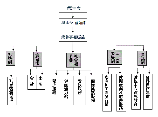 一、理監事會、理事長-蘇如輝、總幹事-廖振益 二、社造組:社區總體營造 三、會務組:會 計、出 納 四、社會福利組:兒少服務、健康活力站、餐飲服務、關懷據點服務 五、產業發展組:休閒產業及旅遊服務、農產加工開發行銷 六、資訊組:資料保存建檔、數位中心資訊教育